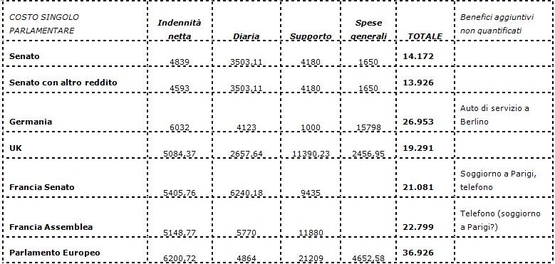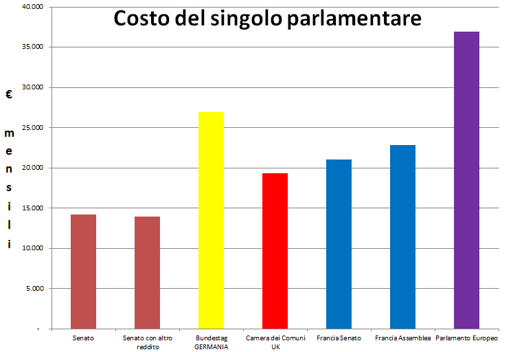 La tabella e il grafico seguenti mostrano che il costo singolo dei senatori italiani è assai inferiore a quello dei parlamentari degli altri principali Paesi europei e dei membri del Parlamento Europeo, nonostante non vengano qui calcolate alcune voci di spesa di altri Paesi – come il soggiorno a Parigi pagato a parte ai senatori francesi – e di cui non esiste quantificazione.