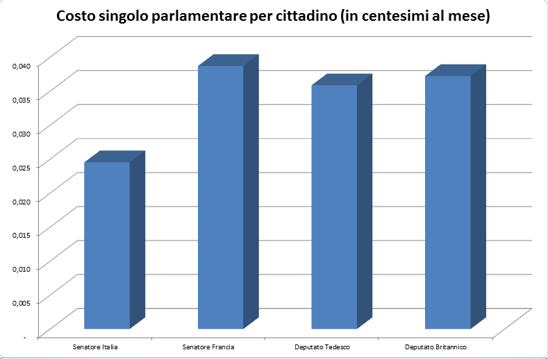 Nota bene: il costo è in centesimi di euro. Dunque, ogni senatore italiano costa poco più di 2 centesimi di centesimi di euro al mese ad ogni italiano: 0,0002 €. Insomma: con un centesimo, il cittadino italiano paga il costo di un senatore per 3 anni e 4 mesi.