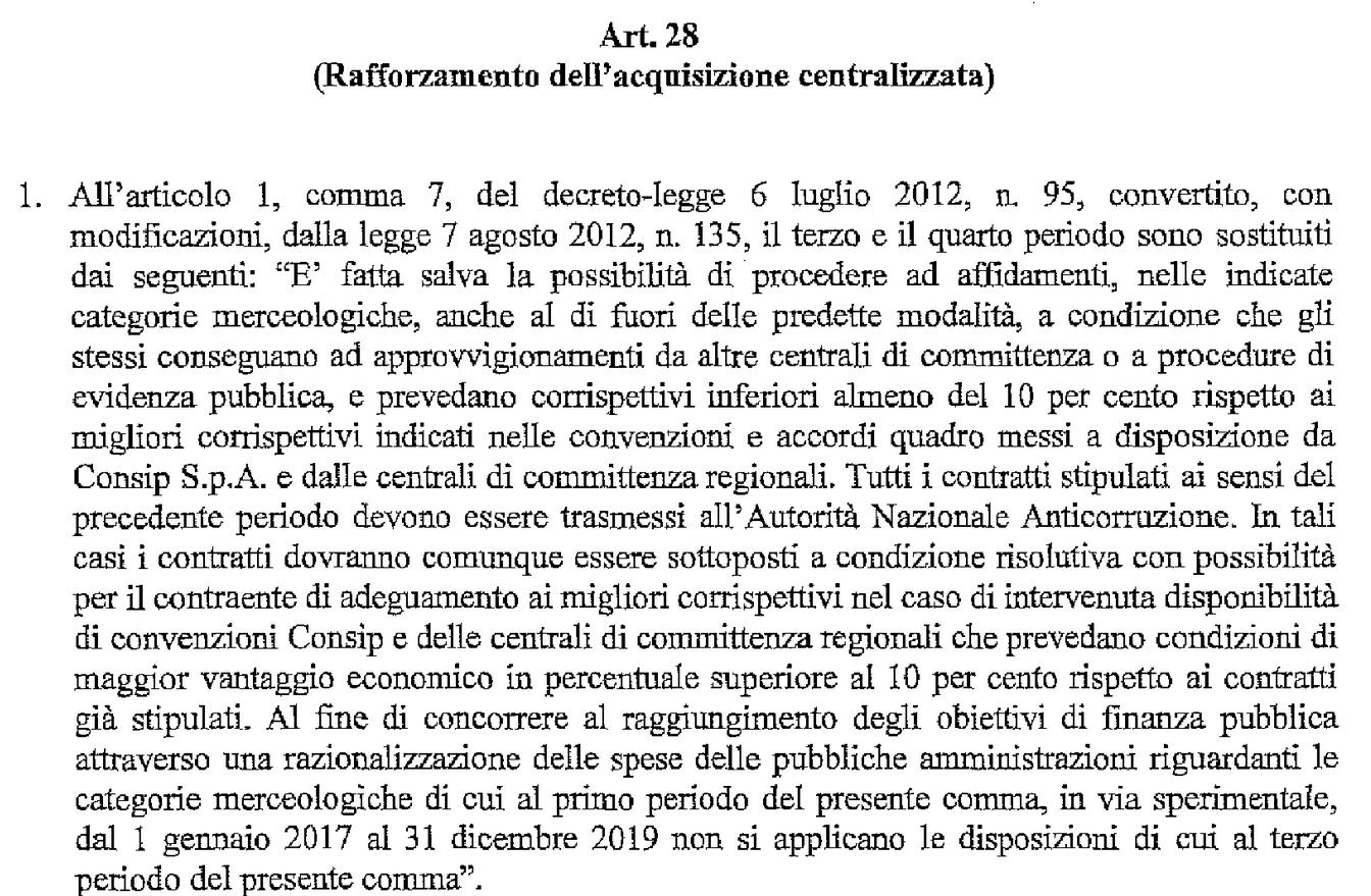 Con l’articolo 28, nuovi irragionevoli vincoli che inducono i Comuni ad acquistare attraverso CONSIP anche quando trovano prezzi inferiori: