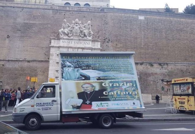 “In via della Conciliazione, incredibile ma vero, il camion-vela è stato bloccato dalla Polizia in borghese e in uniforme. Un sovraintendente del commissariato Borgo ha chiesto a Toni Brandi (presidente di ProVita Onlusndr), per telefono, quale fosse lo scopo dell’iniziativa poiché – parole testuali – ‘il Cardinal Caffarra non era in linea con Papa Francesco”. […]