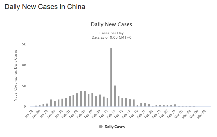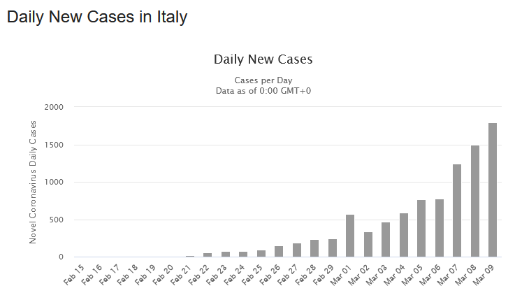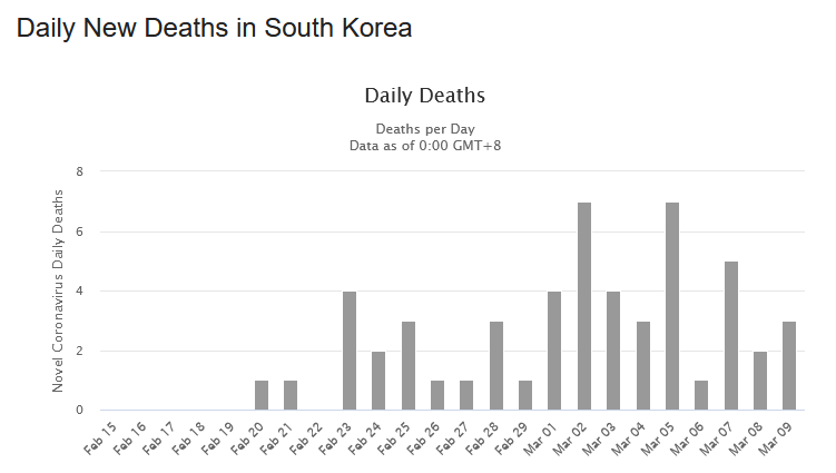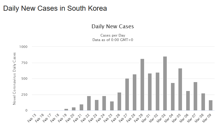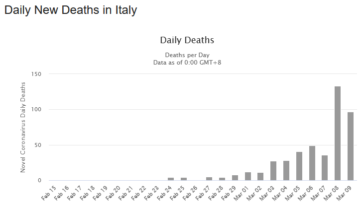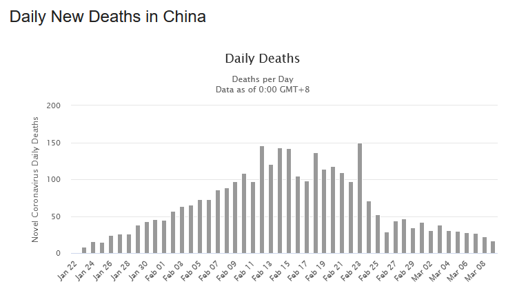 Guardiamo l’andamento dei nuovi casi e dei decessi. In Cina, in Corea del Sud e in Italia. In Italia. In Italia continiamo a salire. In Cina, a circa due settimane dall’imposizione di misure drastiche a Wuhan e nella provincia di Hubei, e in altre località prossime, contagi e decessi sono andati calando. La stessa cosa avviene da alcuni giorni nella Corea del Sud.