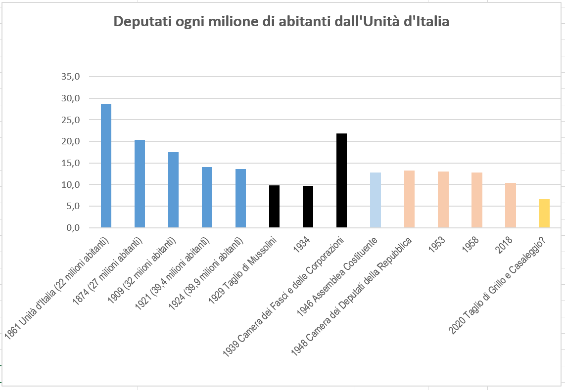 Una modifica costituzionale approvata nel 1963 ha poi stabilito il numero fisso di 630 deputati, indipendente dal numero di abitanti. Siamo così arrivati, nelle ultime elezioni tenute nel 2018, a 10,4 deputati ogni milione di abitanti, appena 0,6 in più che ai tempi dei 400 deputati voluti dal fascismo. Ma molti di meno, se calcoliamo gli aventi diritto al voto: 12,4 ogni milione di elettori nel 2018, contro i 30 ogni milione dell’era mussoliniana.