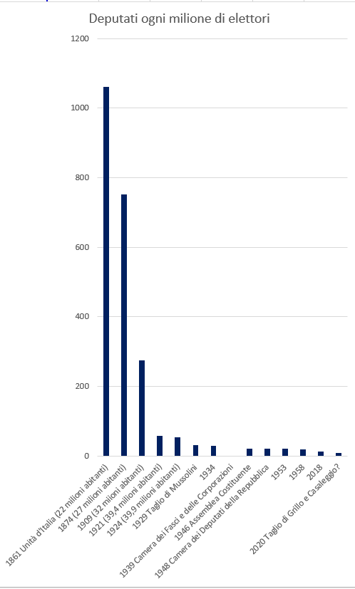 Una modifica costituzionale approvata nel 1963 ha poi stabilito il numero fisso di 630 deputati, indipendente dal numero di abitanti. Siamo così arrivati, nelle ultime elezioni tenute nel 2018, a 12,4 deputati ogni milione di elettori nel 2018, contro i 30 ogni milione dell’era mussoliniana. Con il taglio che ci sarà in caso di vittoria del Sì scenderemo addirittura a 8,1 deputati ogni milionie di elettori.