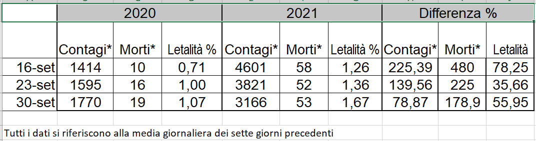 Il confronto fra gli identici giorni del 2021 e del 2020 ci dicono che contagi e morti sono molto più numerosi oggi di un anno fa. La riprova che l’anno scorso era sbagliato tenere medie e licei in DAD e che la decisione di tornare in presenza quest’anno (ma non per chi non ha il Green Pass), non è basata sui numeri, ma è unicamente politica, volta a “premiare” la disponibilità a farsi vaccinare.